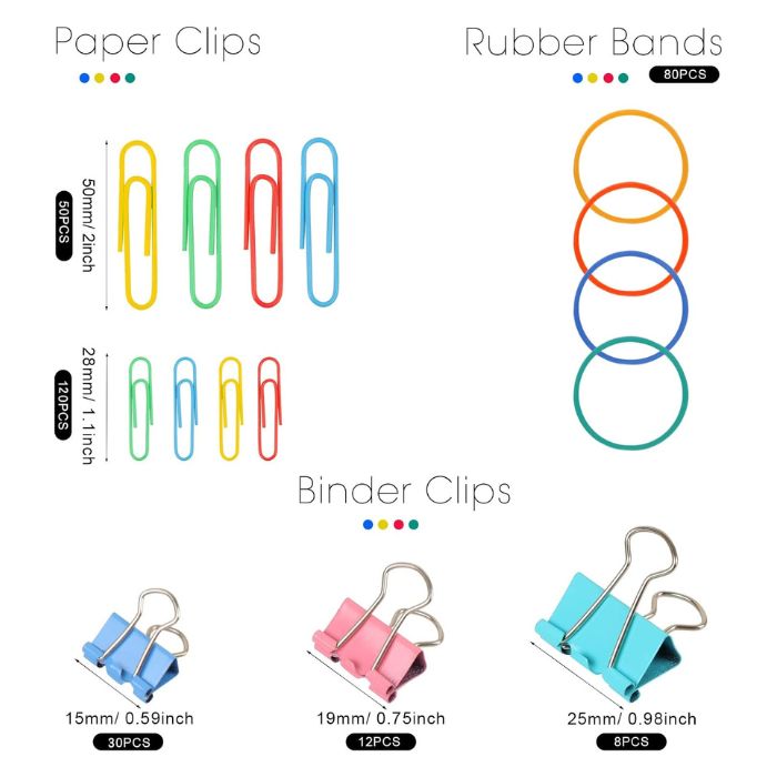 - High cost performance: 50pcs (50mm) and 120pcs (28mm) colour paper clips. 80pcs colour rubber bands. 8pcs (25mm), 12pcs (19mm) and 30pcs (15mm) colour binder clips. They are stored in different grids in reusable plastic containers for easy to find or storage.